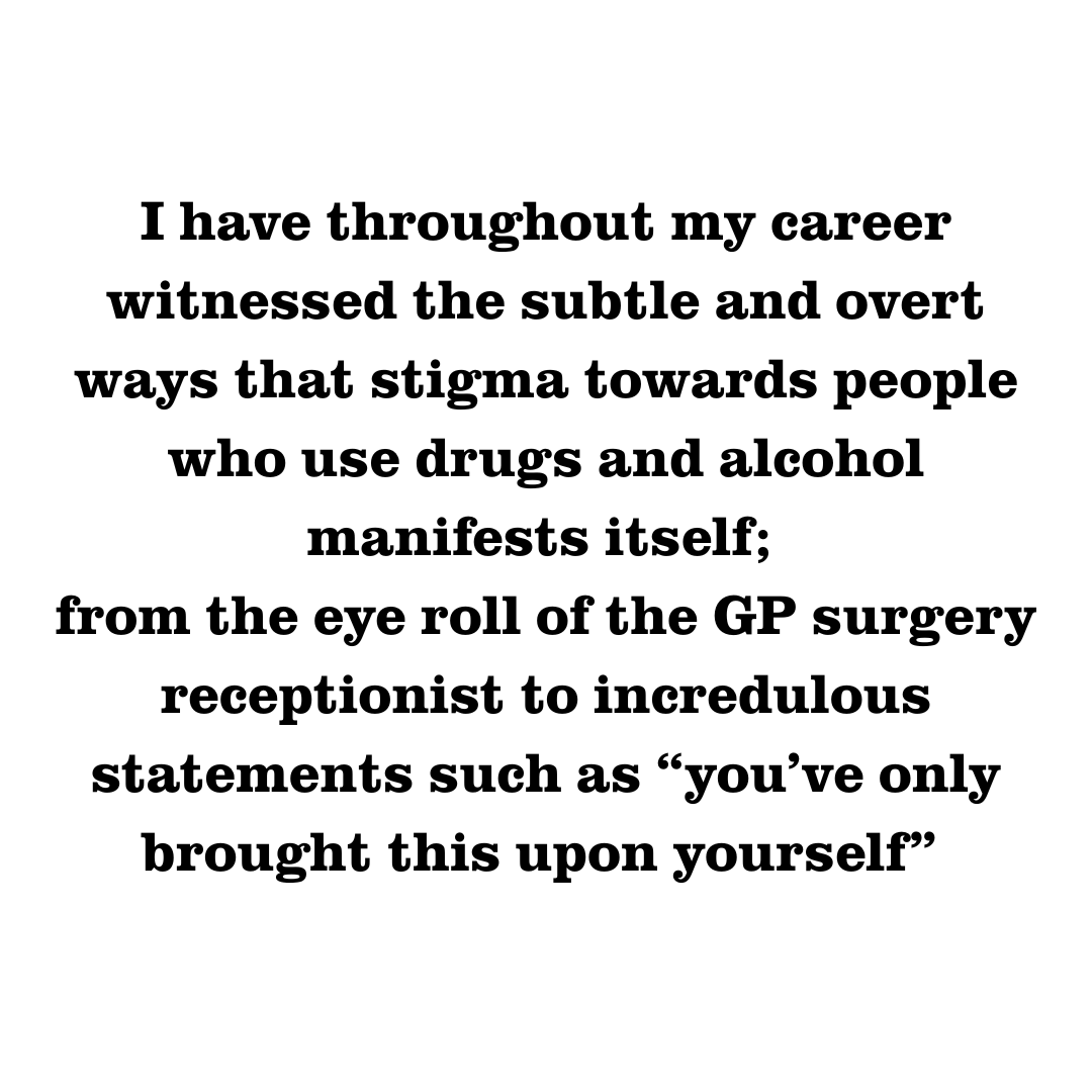 I have throughout my career witnessed the subtle and overt ways that stigma towards people who use drugs and alcohol manifests itself; from the eye roll of the GP surgery receptionist to incredulous statements such as “you’ve only brought this upon yourself” and of course, much worse. I have seen how this impacts on people’s ability to use mainstream services or engage with their communities. At times, I have struggled with how to challenge stigma and discrimination when I have seen or heard it. The truth is, it is often not easy and a direct challenge in a public meeting is not always the best way to support better understanding for people and can even be counterproductive. Over time, I have become more confident in my approach and lent more towards methods of ‘calling people in’ than calling people out. However, there are times when the latter is required but it does need careful consideration before exercising!
